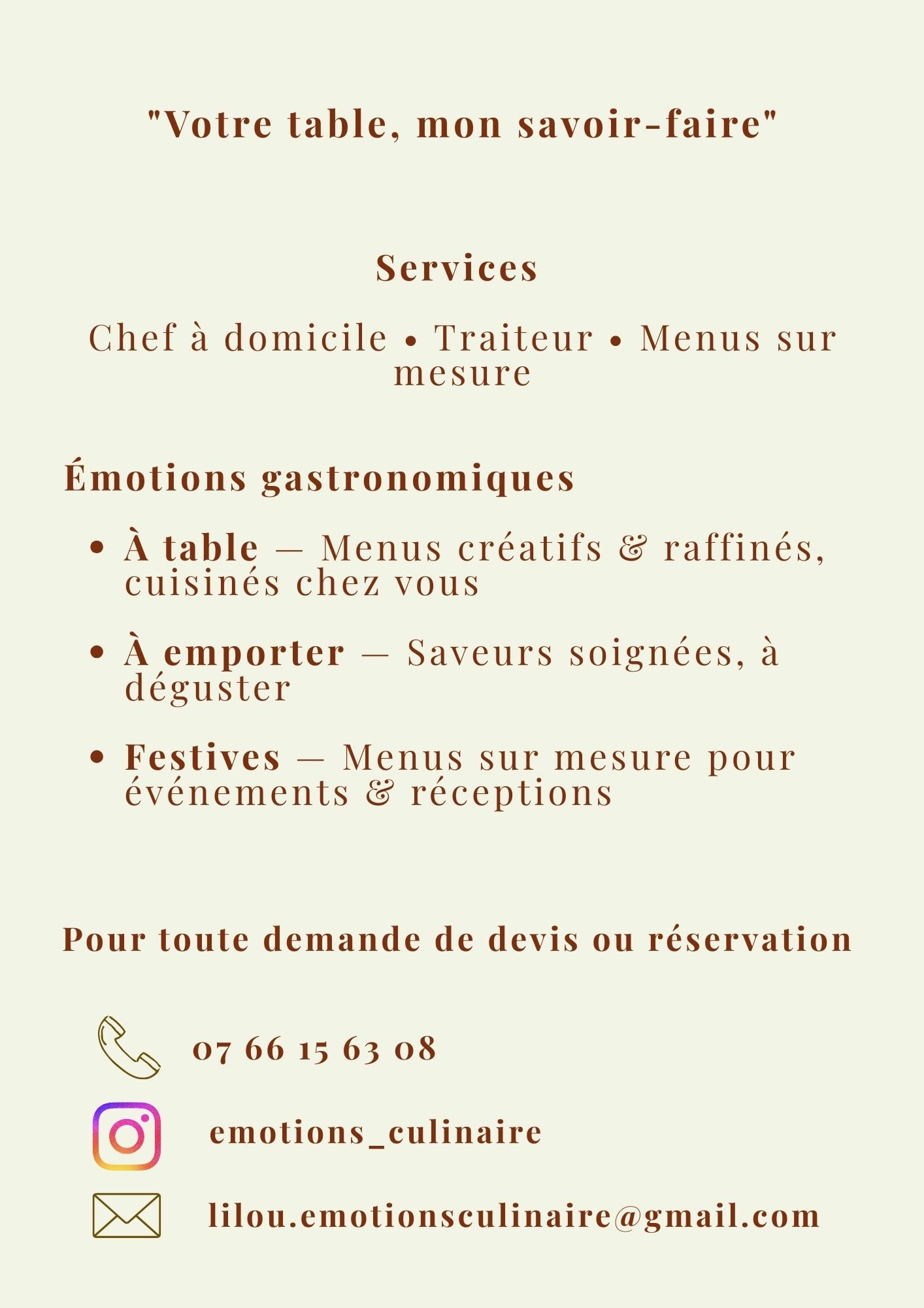 Avec Émotions culinaires , je souhaite offrir bien plus qu’un repas : un moment sincère, gourmand et mémorable.